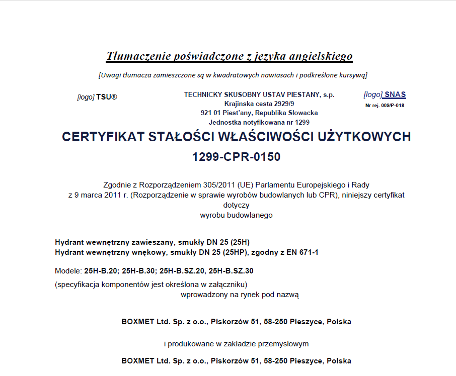 Certyfikat hydranty BOXMET DN25 1299-CPR-0150